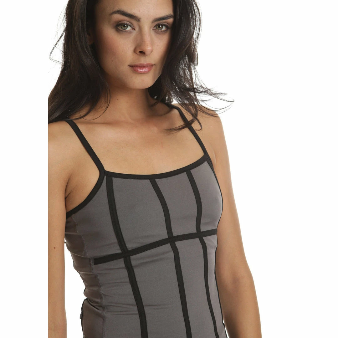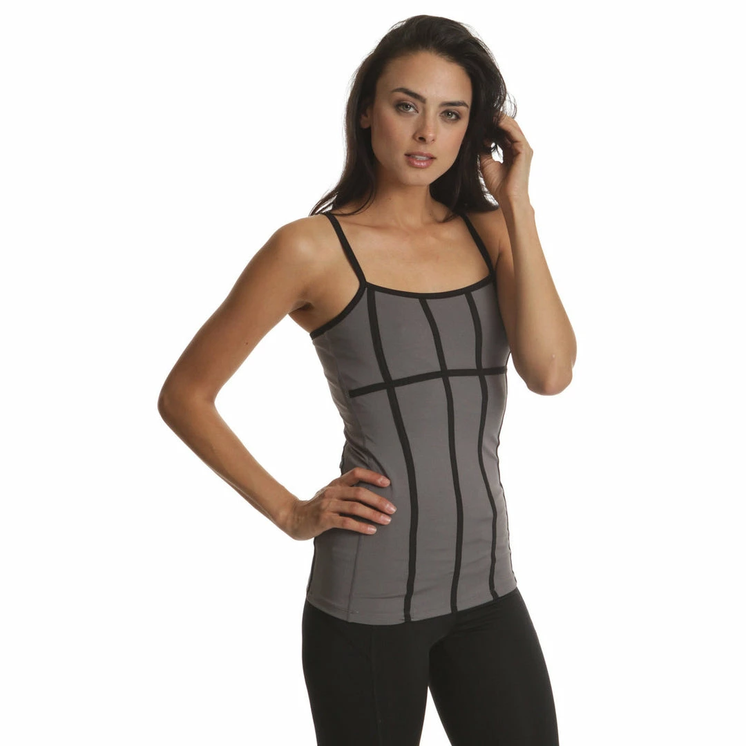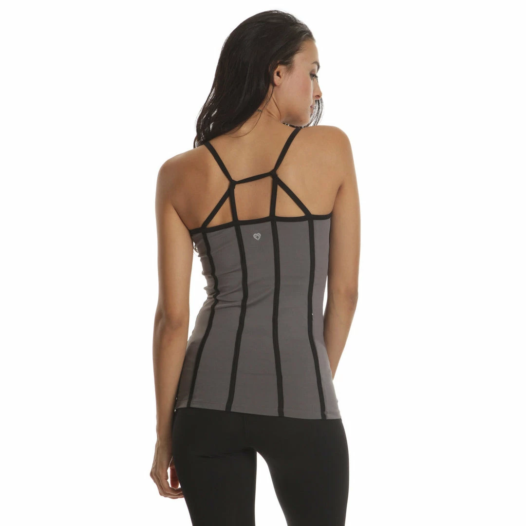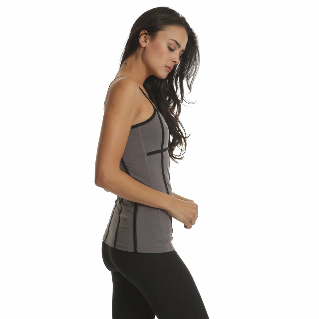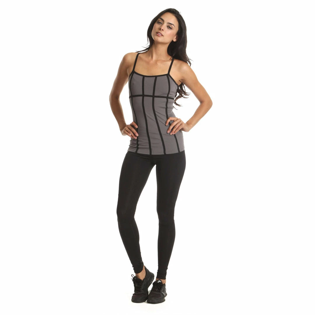 C-Dri moisture management. Strap seaming to contour and emphasize body lines. Anchored cross strap for full range of motion. Build-in bra with removable soft bra cups. Reflective brand logo. 24″ from highest point of shoulder.