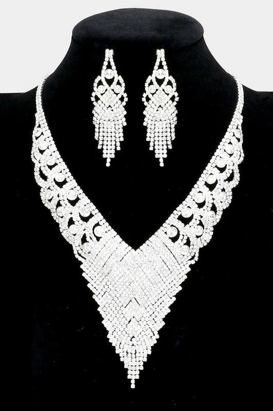 Emprada Accessories Chevron Silver Detailed Rhinestone Necklace & Earrings Set