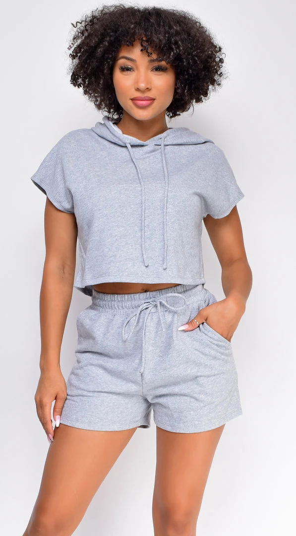 Emprada Chenille Grey Crop Hoodie And Short Set