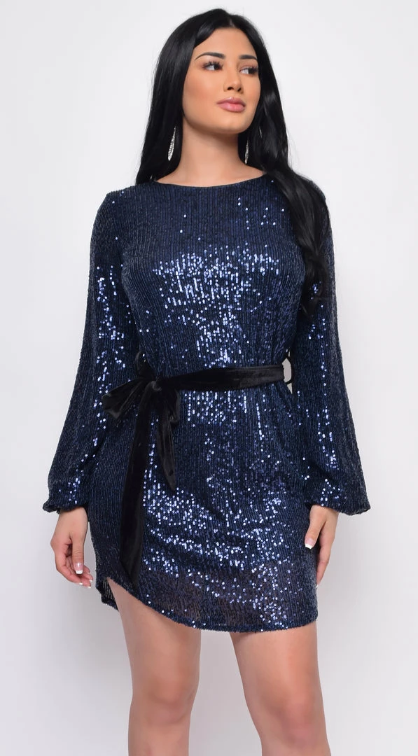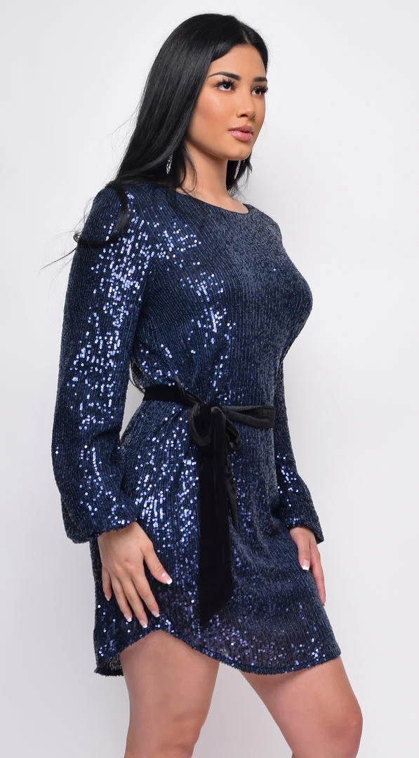 Emprada Crystal Navy Blue Sequin Velour Belt Long Sleeve Dress Dresses