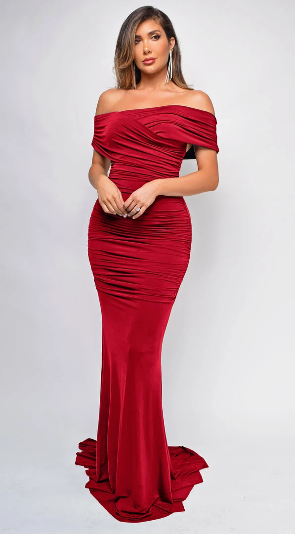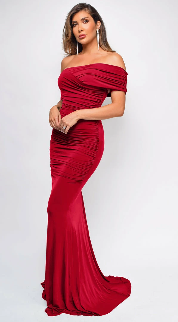 Emprada Divine Burgundy Red Off Shoulder Surplice Gown
