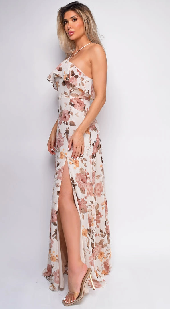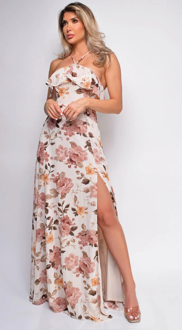 Emprada Dresses Arabella Light Beige Multi Floral Print Maxi Dress