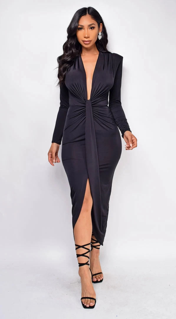 Emprada Dresses Brielle Black Deep Plunge Front Knot Dress