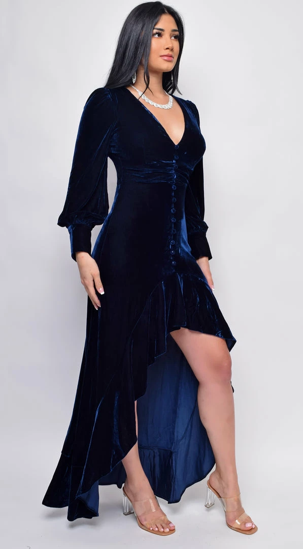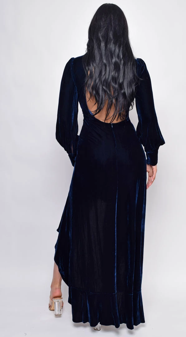 Emprada Dresses Charmed Navy Blue Velvet High Low Hem Ruffle Maxi Dress