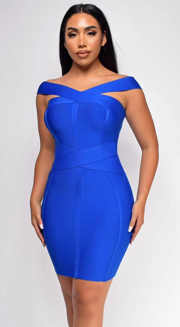 Be the first to review “Emprada Dresses Galilea Royal Blue Off Shoulder Bandage Mini Dress” Cancel reply