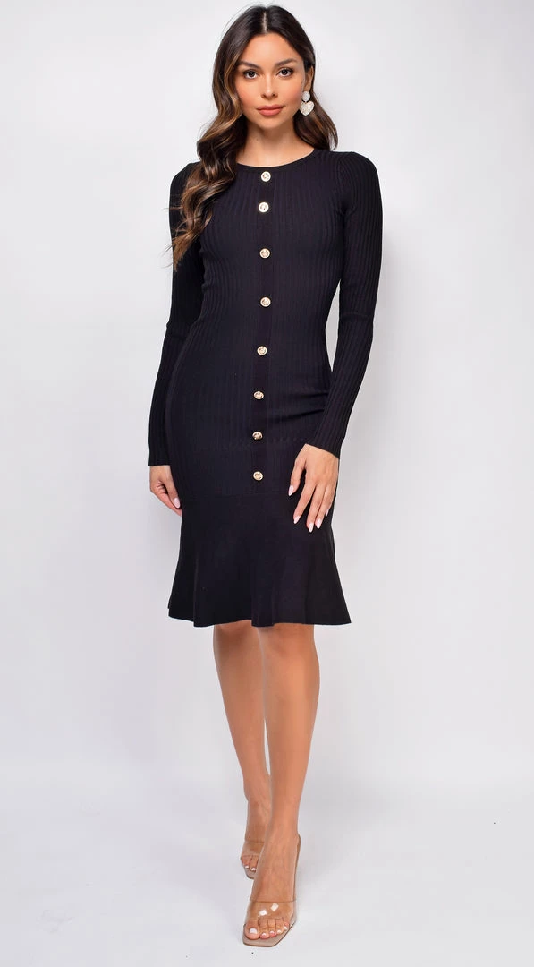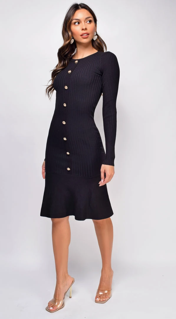 Emprada Dresses Hart Black Button Down Ribbed Midi Dress