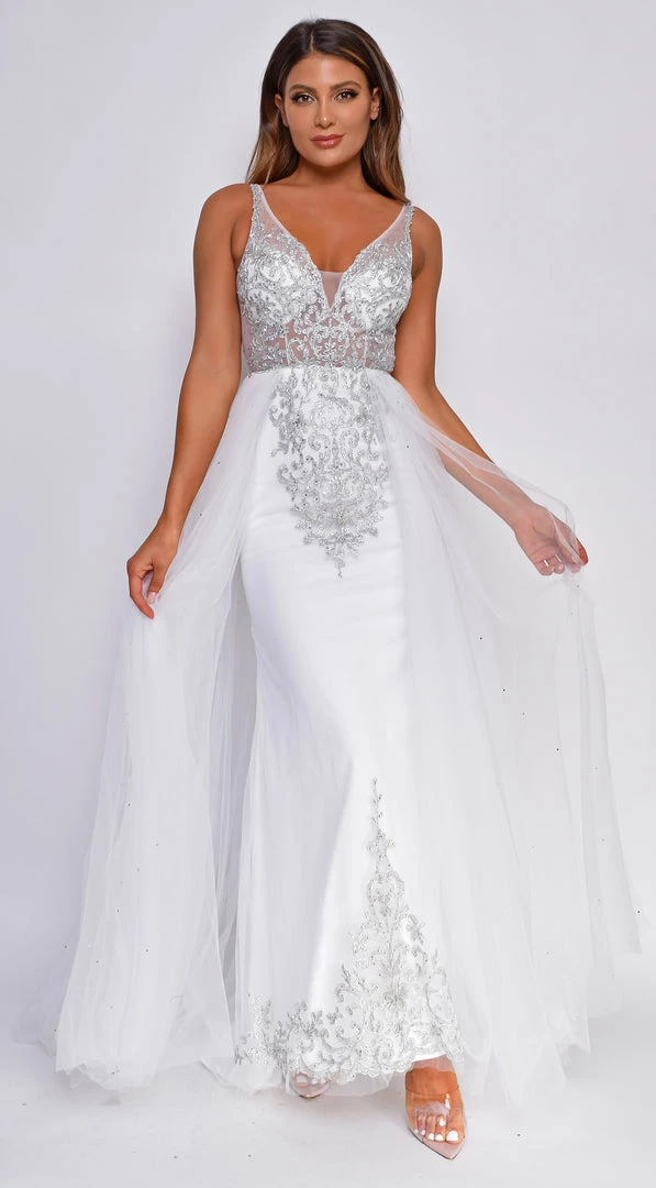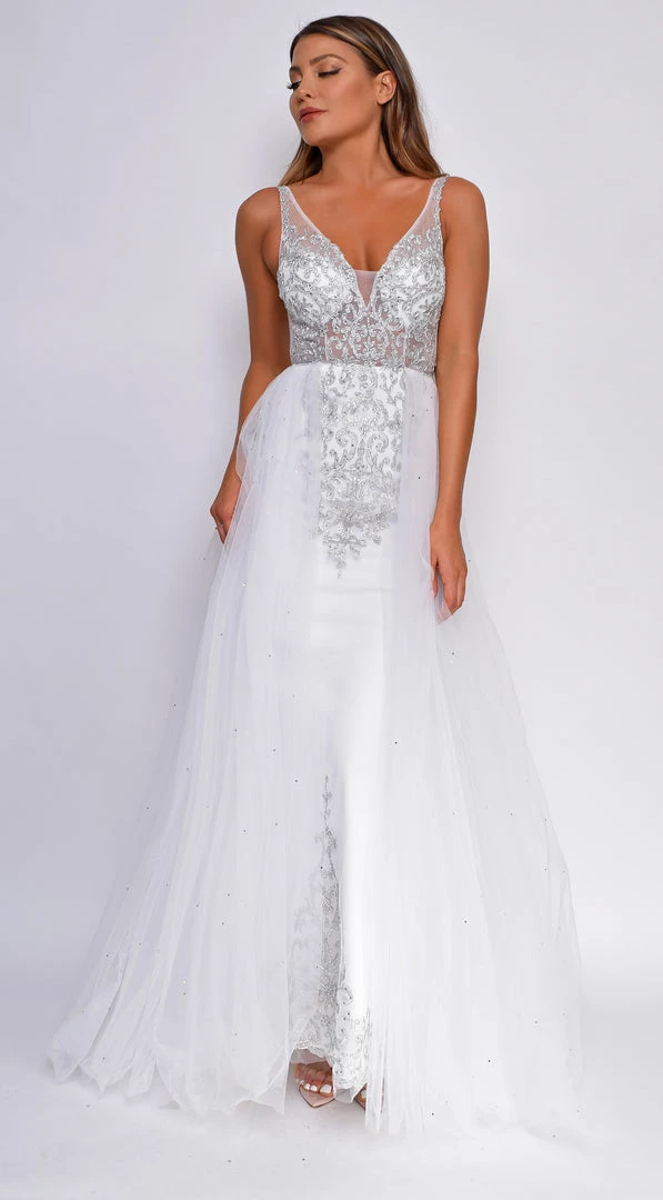 Emprada Dresses Kara Off White Silver Beaded Flyaway Skirt Gown
