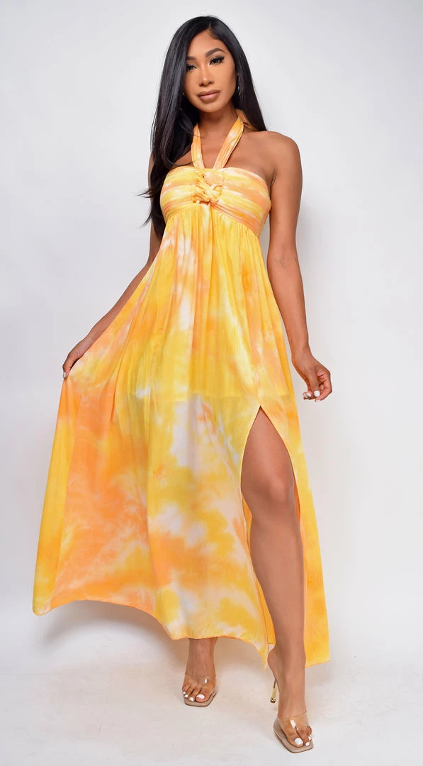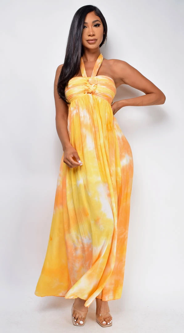 Emprada Dresses Lolita Yellow Tie Dye Halter Neck Maxi Dress