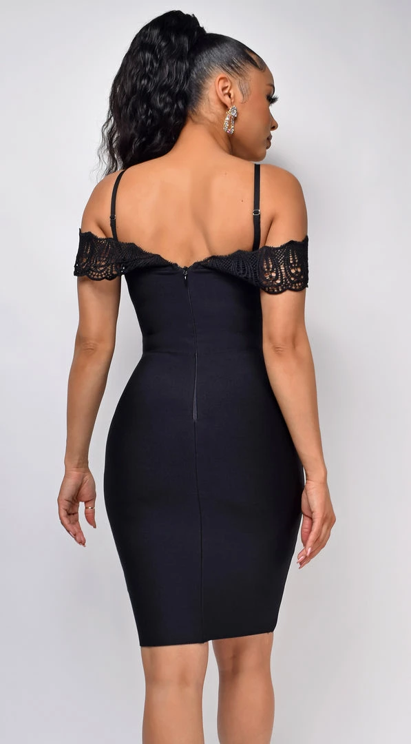Emprada Dresses Novella Black Crochet Lace Off Shoulder Bandage Dress