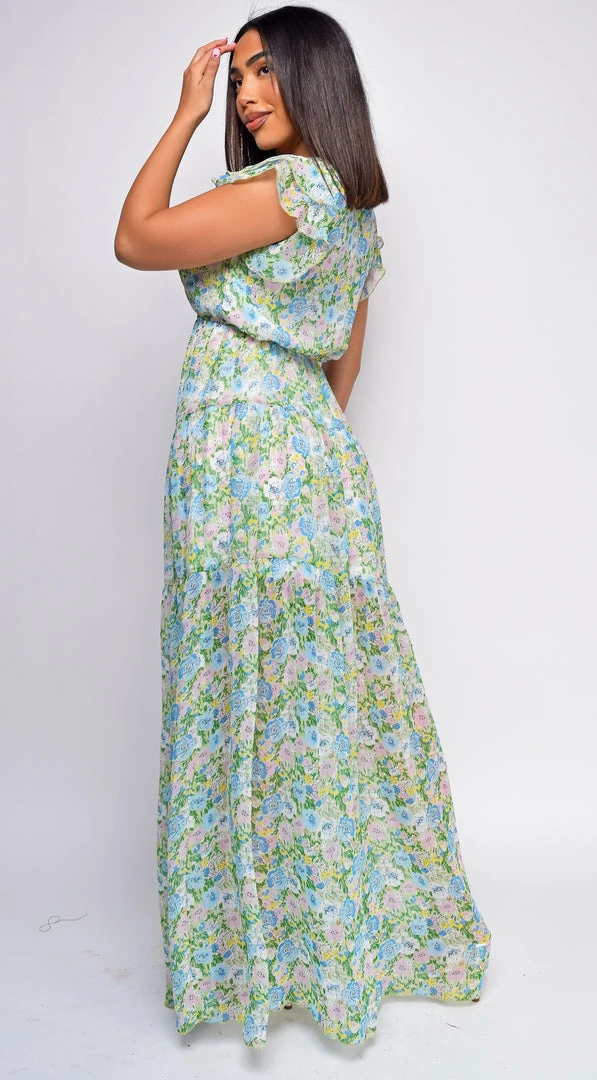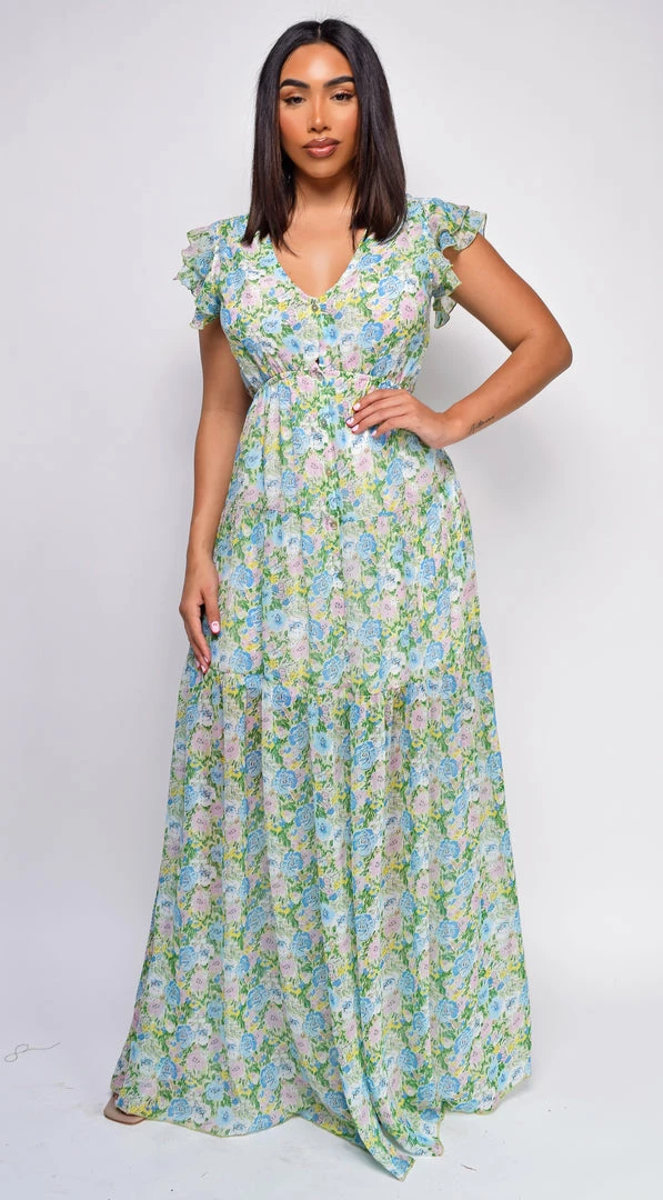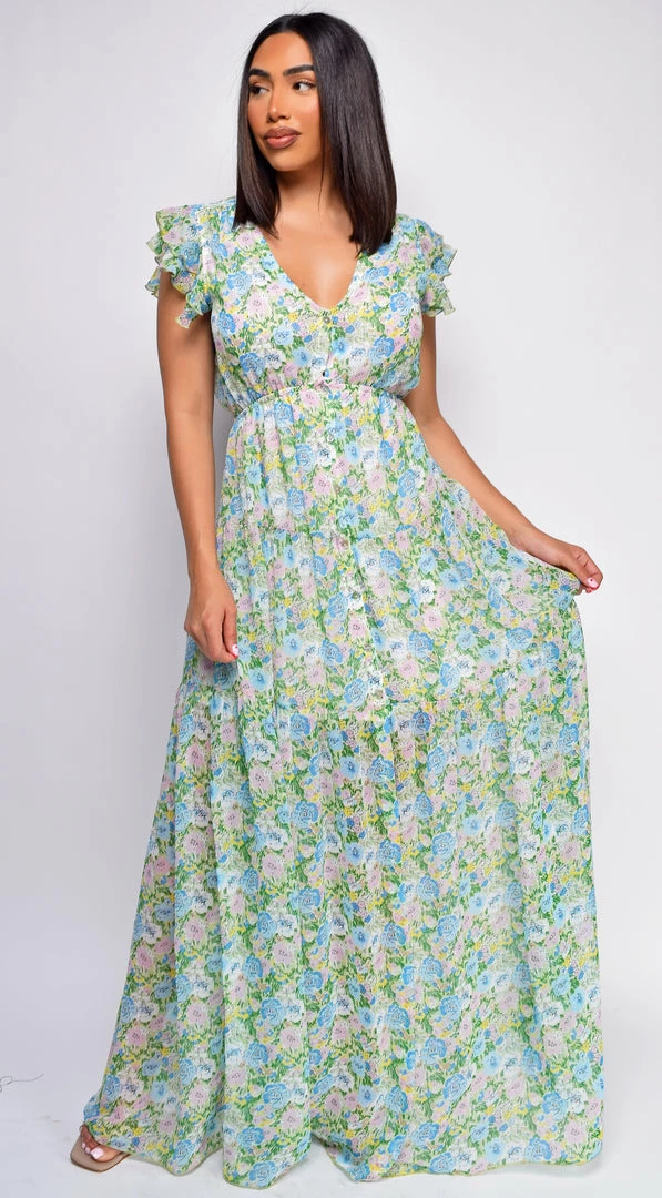 Emprada Dresses Vee Green Multi Floral Print Ruffle Maxi Dress