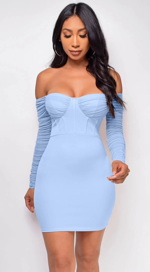 Emprada Dresses Yasna Blue Mesh Ruched Sleeve Dress