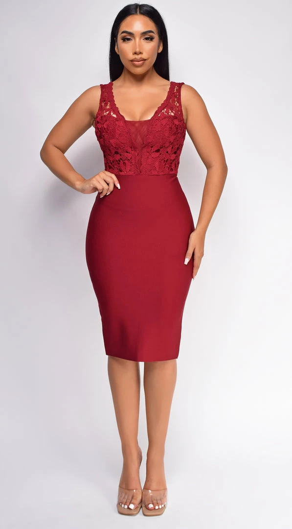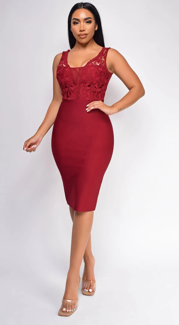 Emprada Freya Wine Red Crochet Lace Bandage Dress