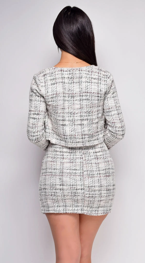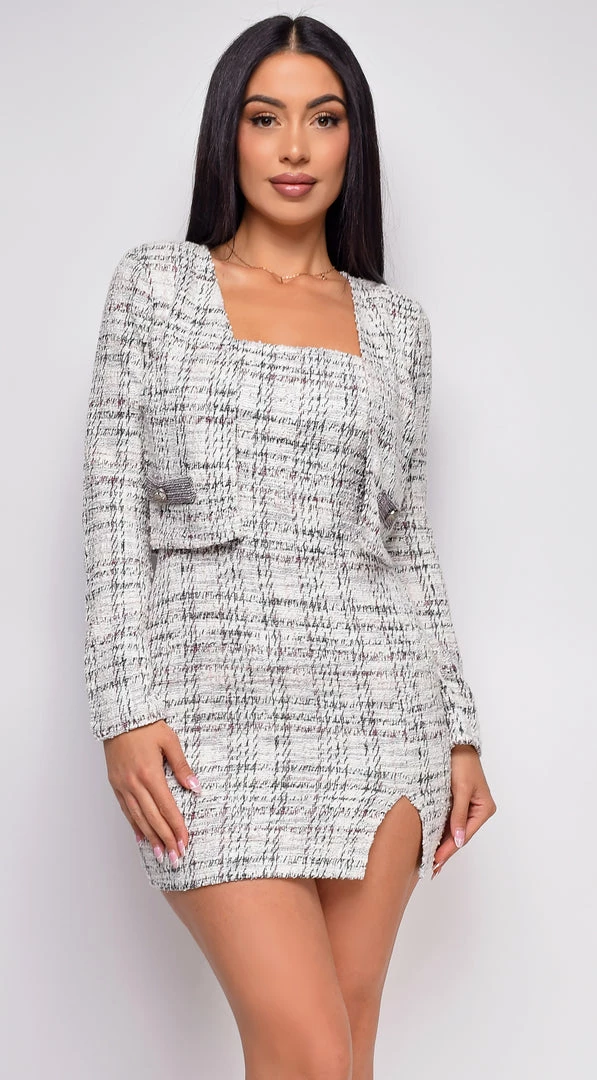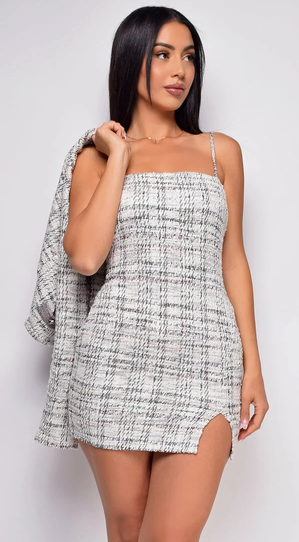 Emprada Giorgiana Grey Plaid Slit Dress & Crop Blazer Set Dresses