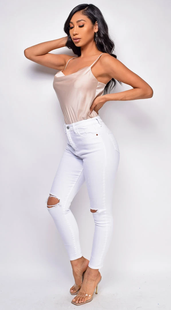 Emprada Jolie Nude Beige Cowl Neck Satin Bodysuit