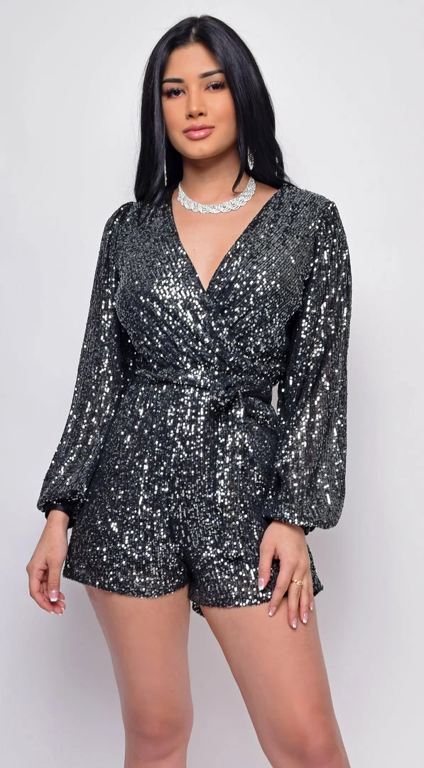 Emprada Jumpsuits & Rompers Anja Black Sequin Wrap Over V Neck Long Sleeve Romper