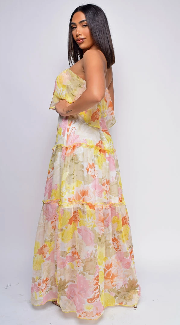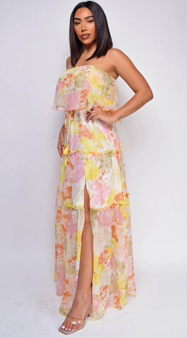 Emprada Kelly Yellow Multi Floral Print Tube Sleeveless Side Slit Dress Dresses