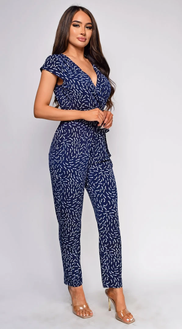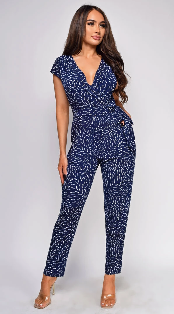 Emprada Kimmy Navy White Abstract Surplice Side Tie Jumpsuit