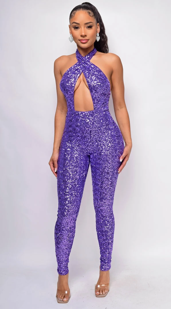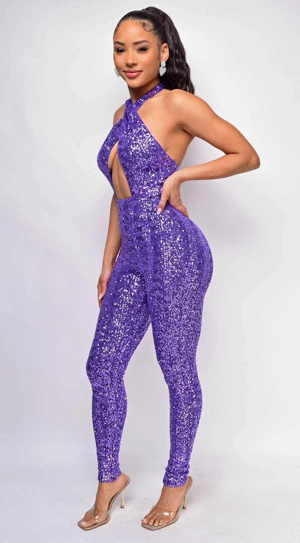 Emprada Lacie Purple Sequin Cross Over Neck Jumpsuit