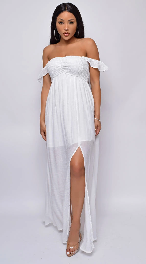 Emprada Lagos White Off Shoulder Boho Smocked Maxi Dress
