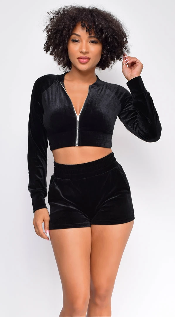 Emprada Loungewear Tempted To Touch Black Velour Crop Hoodie Shorts Set