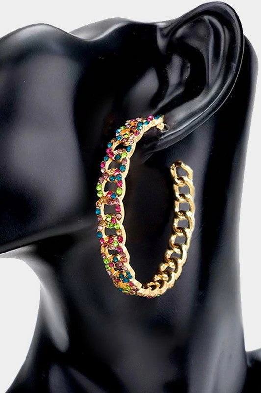 Emprada Metal Chain Gold Multi Color Rhinestone Embellished Hoop Earrings Accessories