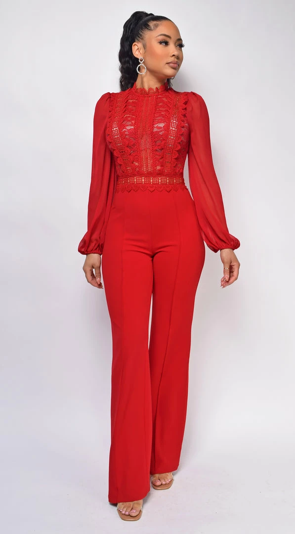Emprada Nerine Red Crochet Lace Mesh Jumpsuit Jumpsuits & Rompers