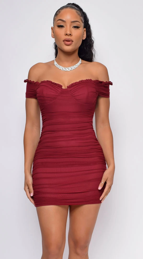 Emprada Never Again Wine Red Off Shoulder Ruched Dress Dresses