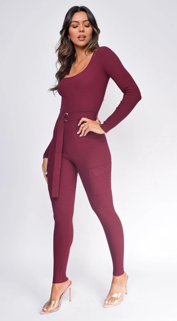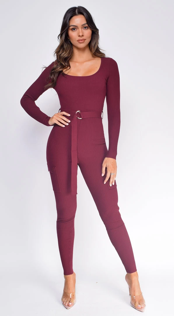 Emprada Nichol Burgundy Red Cargo Pocket Ribbed Jumpsuit Jumpsuits & Rompers