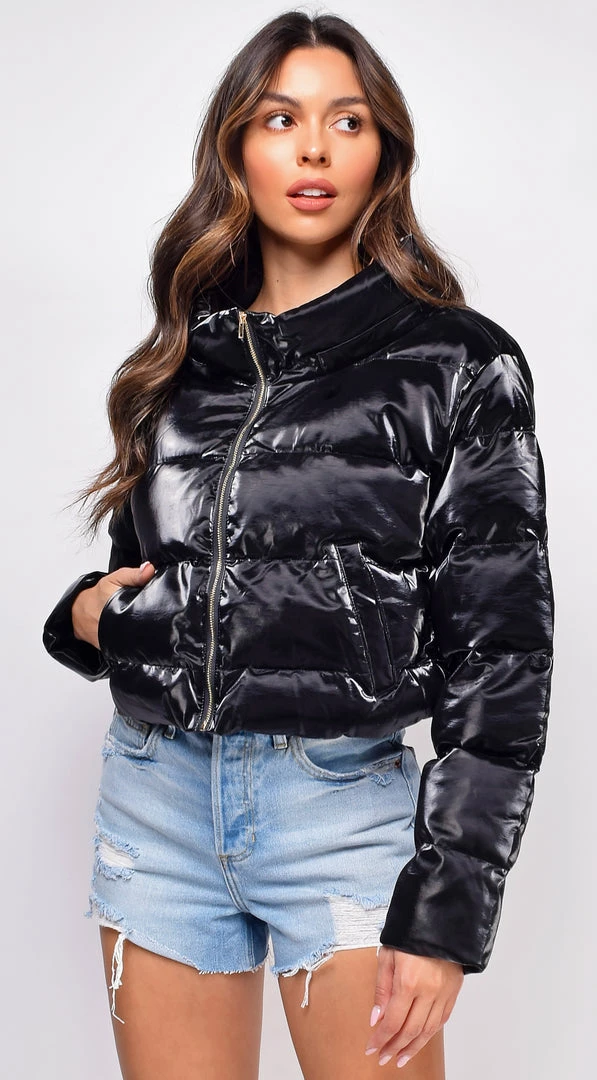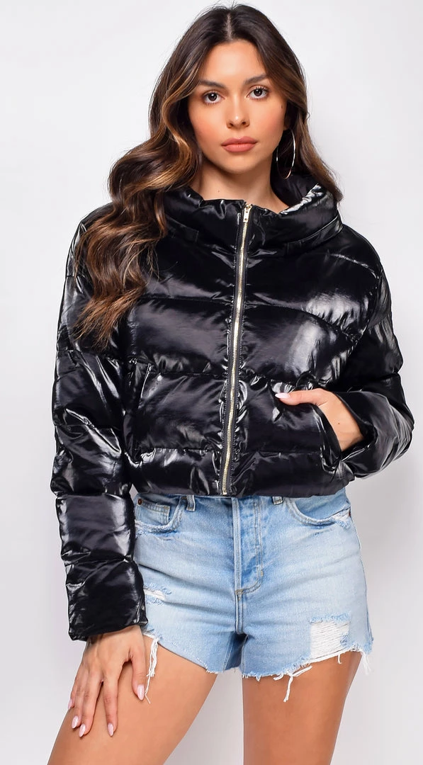 Emprada Outerwear Rai Black PU Leather Crop Puffer Jacket