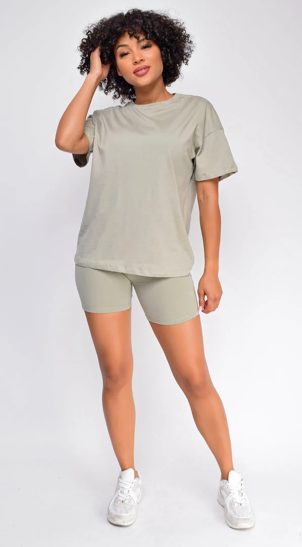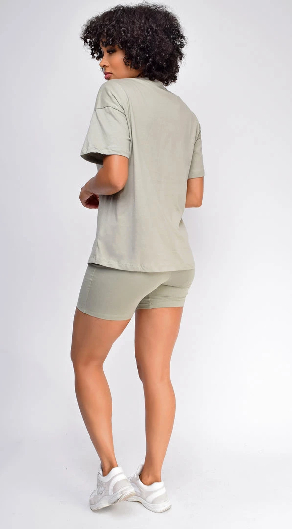 Emprada Oversized Olive Green T-Shirt And Biker Short Two Piece Set