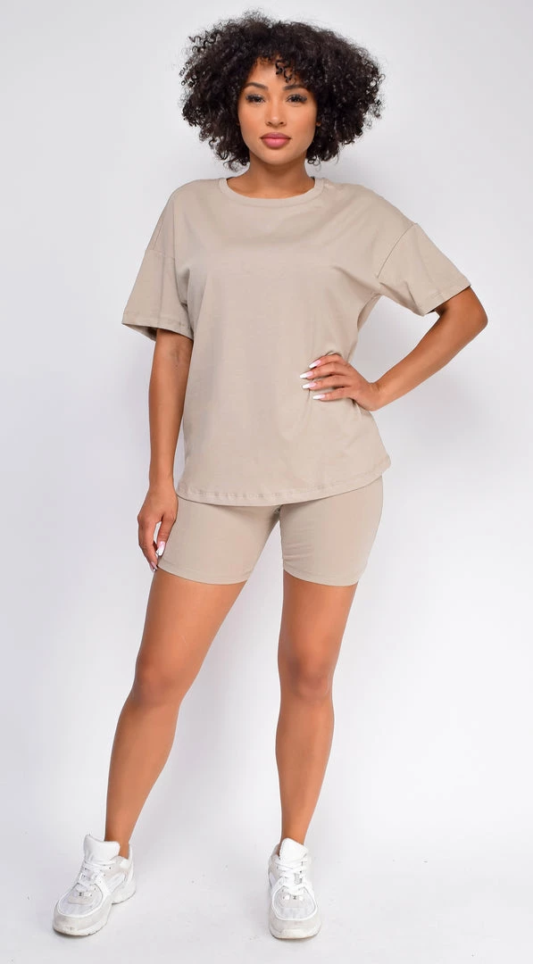 Emprada Oversized Sand Beige T-Shirt And Biker Short Two Piece Set