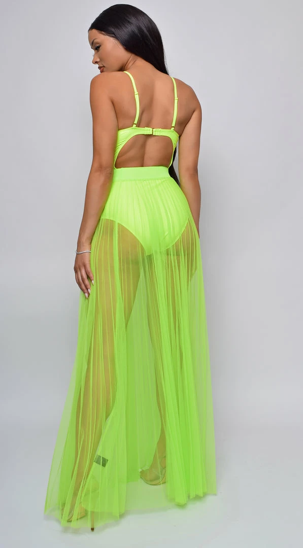 Emprada Palmaria Neon Lime Pleated Sheer Tulle Maxi Cover-up Skirt