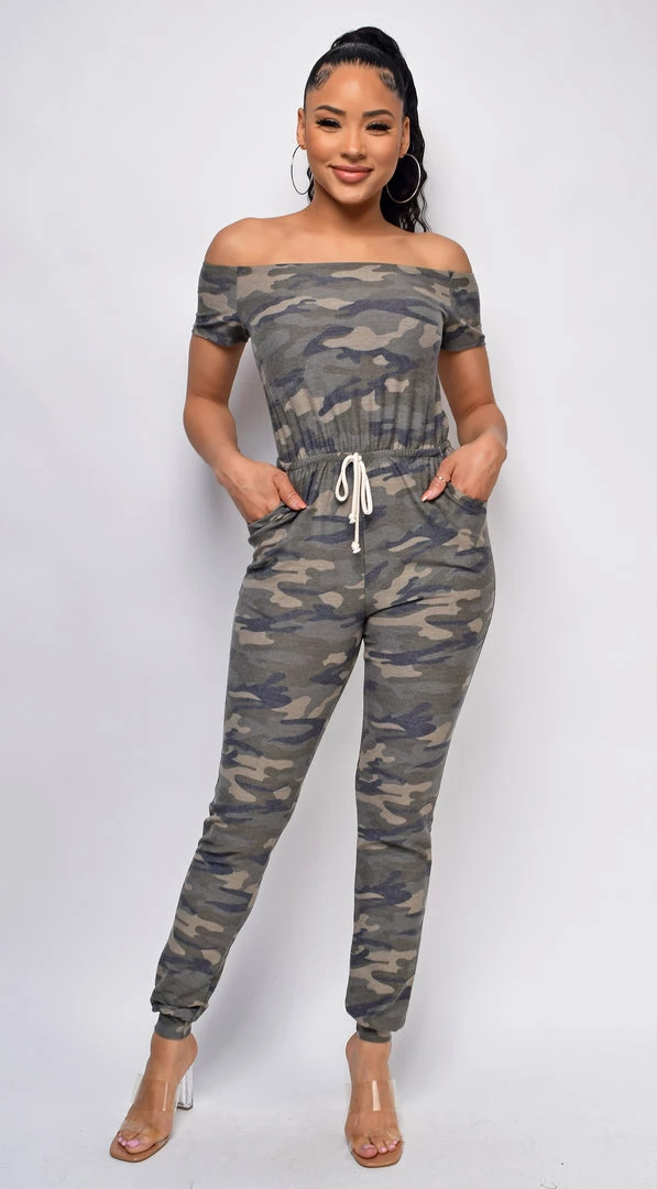 Emprada Rise And Lounge Green Off Shoulder Camo Jumpsuit Loungewear