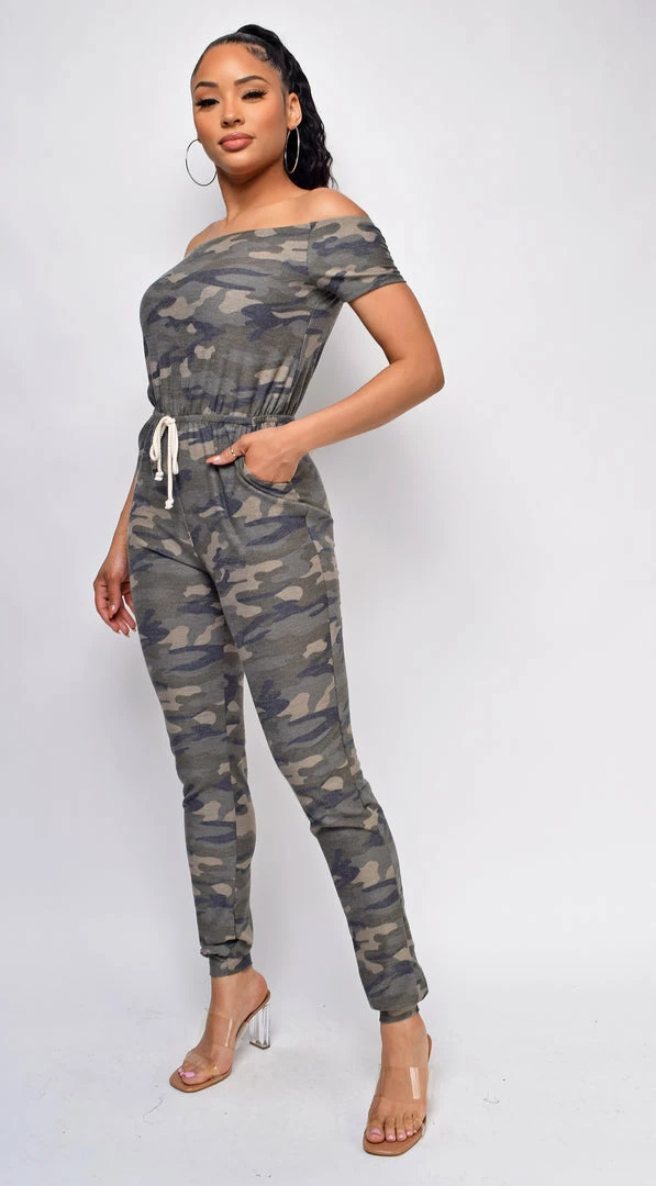 Be the first to review “Emprada Rise And Lounge Green Off Shoulder Camo Jumpsuit Loungewear” Cancel reply