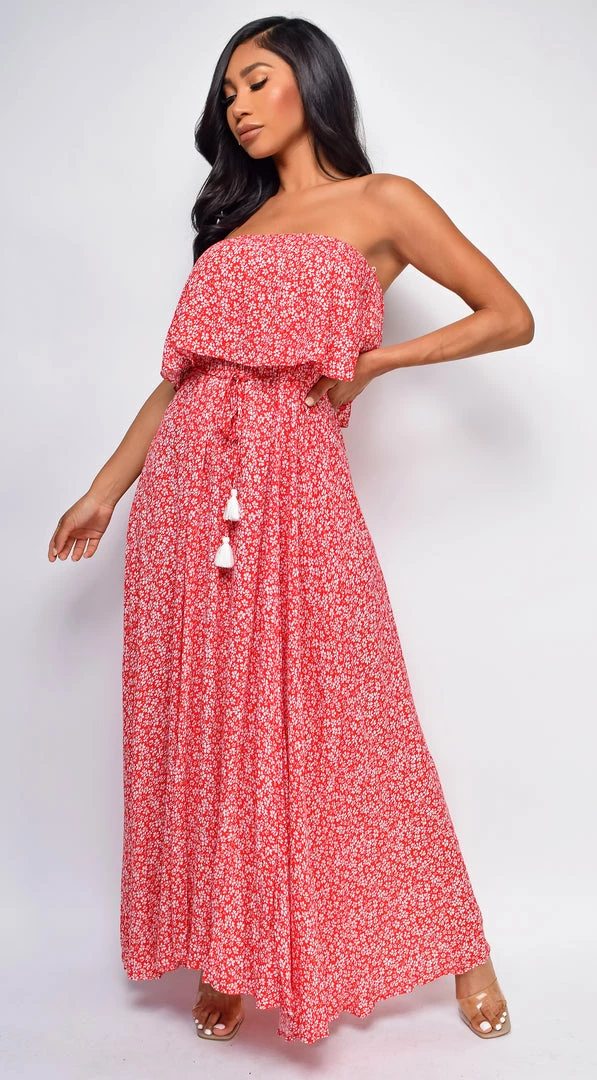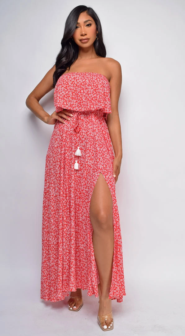 Emprada Rorie Red Floral Tube Sleeveless Side Slit Dress Dresses