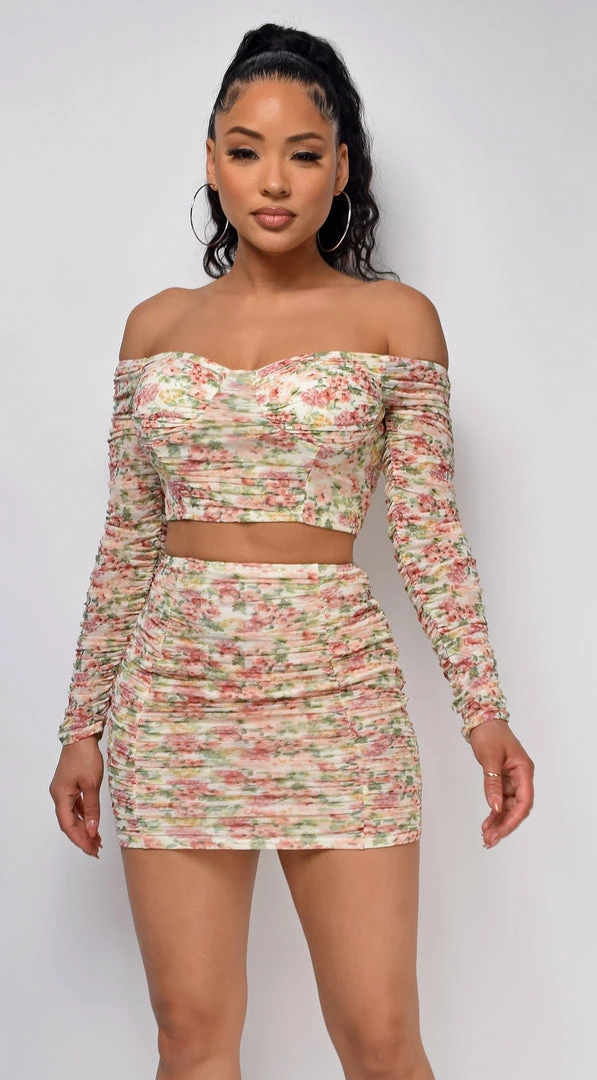 Emprada Sets Quincy Nude Floral Print Off Shoulder Top & Skirt Set