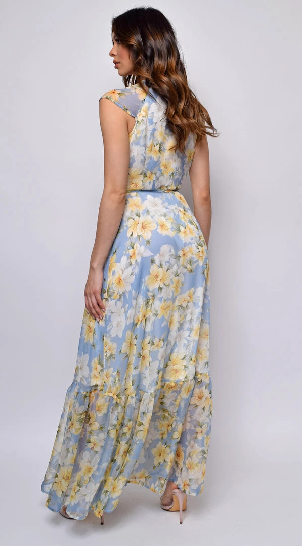 Emprada Sweet Sunset Blue Yellow Print Cap Sleeve Wrap Maxi Dress