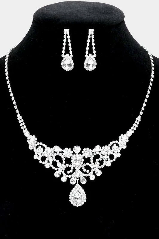 Emprada Teardrop Silver Stone Accented Rhinestone Necklace & Earrings Set Accessories