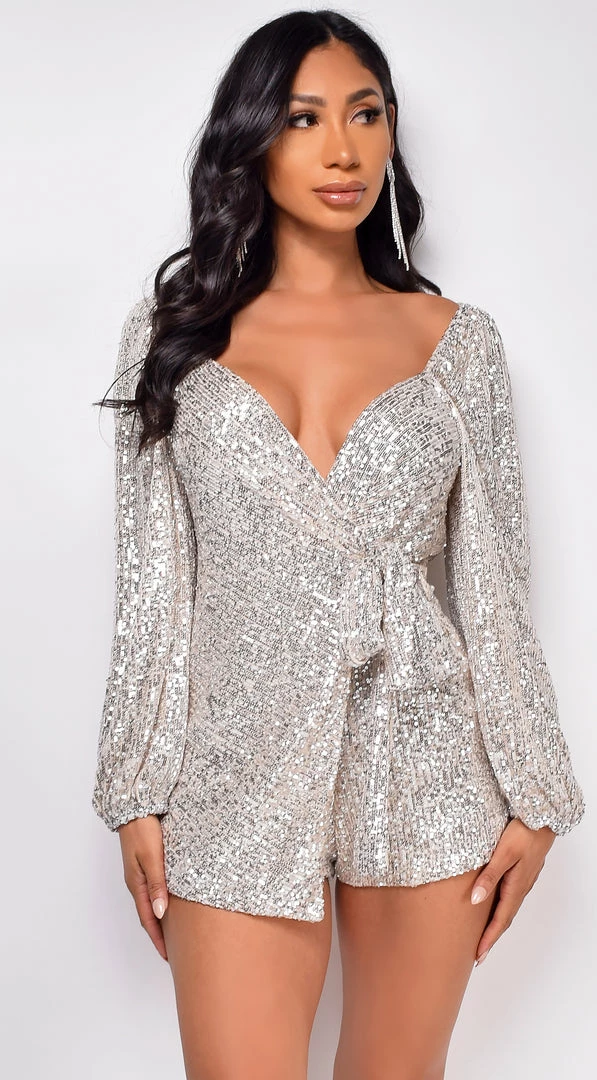 Emprada Tempo Silver Sequin Long Sleeve Belted Romper Jumpsuits & Rompers