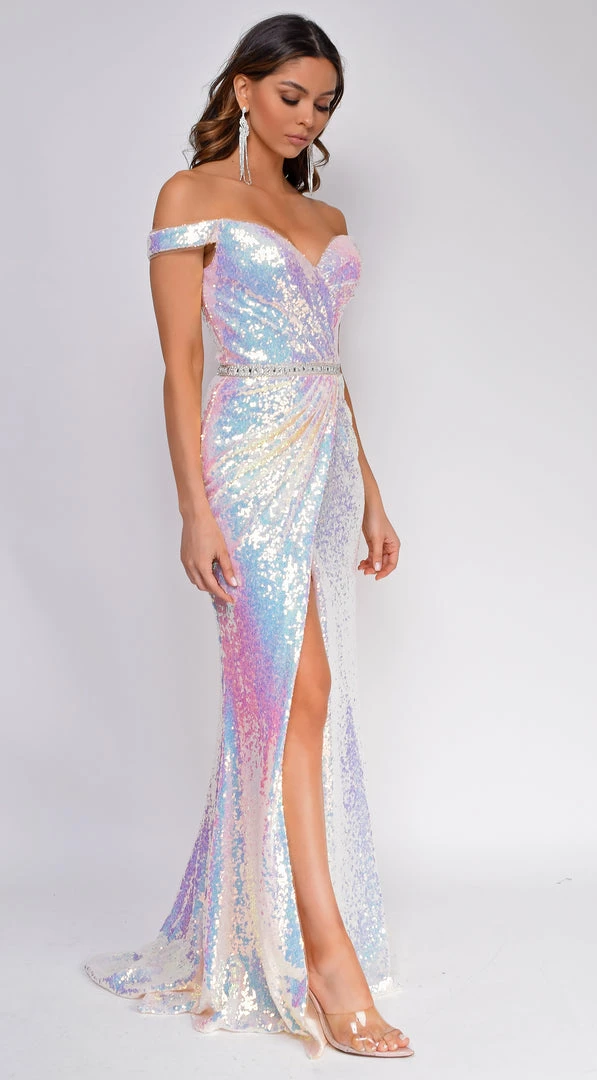 Emprada Vanessa Opal White Multi Off Shoulder Wrap Sequin Gown Dresses