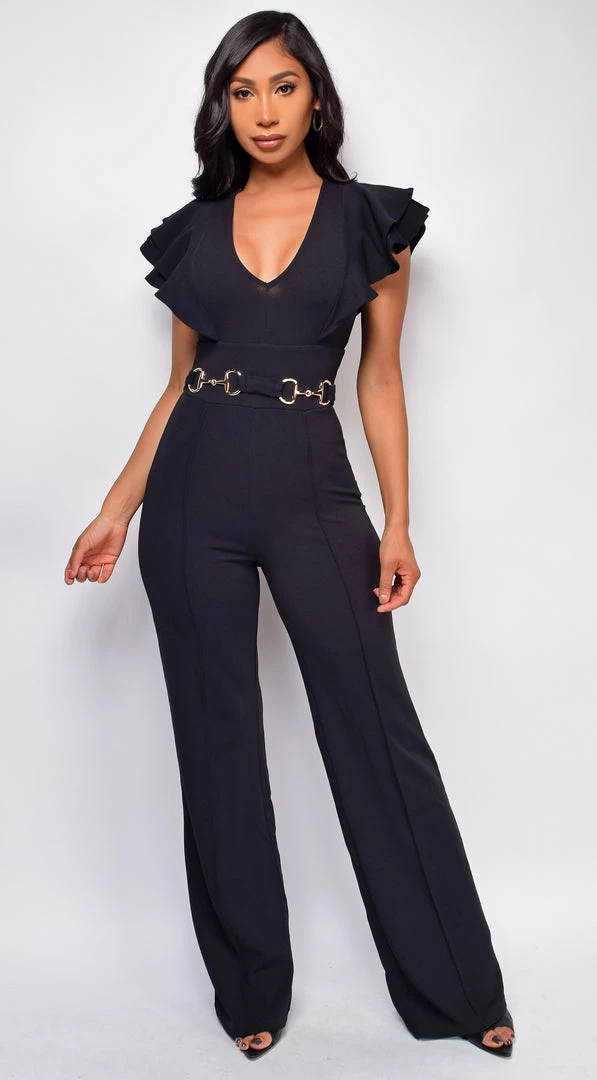 Emprada Vivia Black Gold Buckle Ruffle Sleeve Jumpsuit Jumpsuits & Rompers